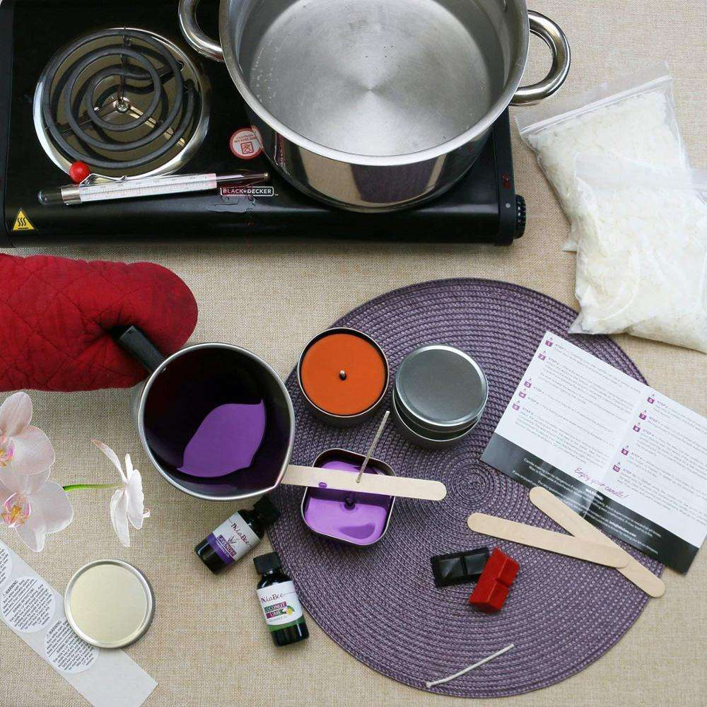 Необходимые инструменты: специальный ковш для плавления воска (рекомендуется метод паровой бани), мешалка, термометр для контроля температуры (важно для работы с соевым воском) и понятные пошаговые инструкции.
