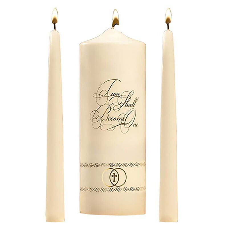 A complete wedding candle set typically includes three coordinated candles that serve distinct liturgical and ceremonial functions during the wedding Mass or service :